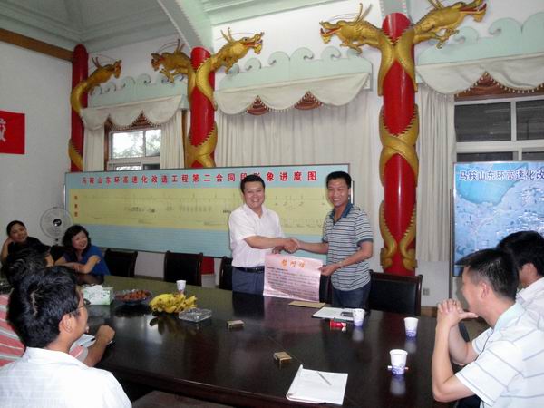 最后,在一陣熱烈的掌聲中,胡主席向我部項目經理冷峰遞交了慰問信和慰問金。