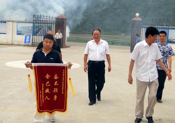 715,公司宜巴09標(biāo)項(xiàng)目部禮炮聲隆隆,喜氣洋洋。宜昌市夷陵區(qū)霧渡河鎮(zhèn)富貴汽修廠為感謝公司員工奮不顧身搶救落水人員特送來錦旗,錦旗上寫著“奮不顧身,舍己救人”。