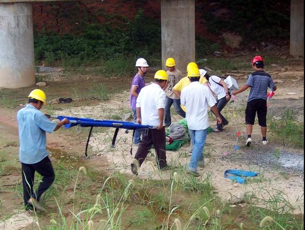 接下來,對參演人員進(jìn)行角色分工和任務(wù)分配。所有參加演練的人員來到項(xiàng)目正在進(jìn)行的30米箱梁預(yù)制場門架附近待命。4點(diǎn)鐘,演練行動正式開始。項(xiàng)目負(fù)責(zé)人接到報告,K11+300水陽江1#橋面施工區(qū)域發(fā)生高墜事故。由于水陽江橋施工現(xiàn)場地處偏遠(yuǎn),距離主干道路和項(xiàng)目部及醫(yī)院都較遠(yuǎn),給自救和救援帶來嚴(yán)重考驗(yàn)。搶救疏散組及時啟動《高墜事故應(yīng)急救援預(yù)案》,在以項(xiàng)目經(jīng)理為主的事故應(yīng)急救援領(lǐng)導(dǎo)小組領(lǐng)導(dǎo)下,各事故應(yīng)急救援機(jī)構(gòu)各司其職。搶救疏散組立即組織搶救受傷人員,將汽車、設(shè)備、救護(hù)人員派到事發(fā)地點(diǎn),并對現(xiàn)場人員進(jìn)行疏散隔離。救護(hù)人員第一時間對高墜傷者進(jìn)行了初步檢查,判定傷者暫時沒有生命危險,并對其發(fā)生骨折的右上肢進(jìn)行了夾板保護(hù),在搶救疏散組的協(xié)作下,傷者立即通過擔(dān)架進(jìn)行轉(zhuǎn)移,送往醫(yī)院。