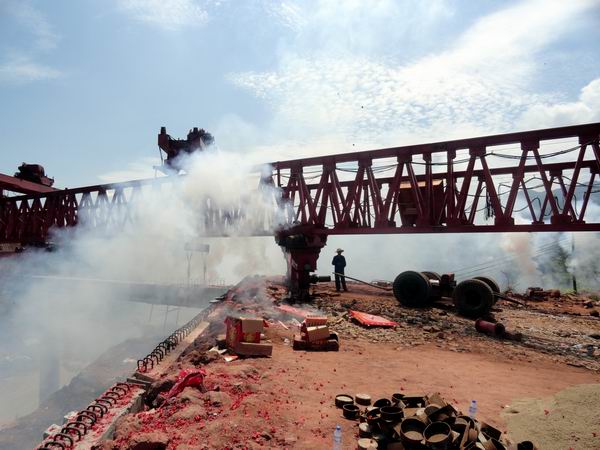 上午10點30分,項目辦、高駐辦等相關(guān)領(lǐng)導(dǎo),在公司總經(jīng)理助理丁世國、項目經(jīng)理羅權(quán)等的陪同下,親臨我盤石分離立交梁板安裝施工現(xiàn)場指導(dǎo)安裝工作。10點40分,架梁工作正式開始,現(xiàn)場頓時鞭炮齊鳴、禮花綻放。 10點58分,首片梁板順利安裝。