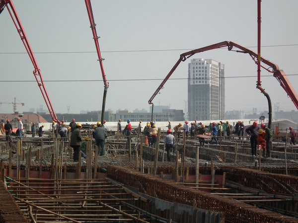 在澆筑過程中,項目部技術(shù)員全部上陣,并一直堅持到結(jié)束,休息和三餐全部在澆筑現(xiàn)場解決。安全管理人員也全部到場,5名安全員分別把守著高壓線四端,確保澆筑安全距離,防止輸送泵車的大臂觸電。項目部和監(jiān)理部主要負(fù)責(zé)人也在場檢查、督導(dǎo)澆筑質(zhì)量和安全。