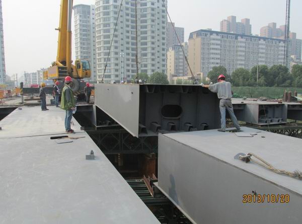 回顧跨南淝河橋鋼箱梁的施工過程,項目全體員工共同努力,克服了許多技術(shù)和吊裝難題。工程前期現(xiàn)場勘查發(fā)現(xiàn),橋梁東側(cè)位于現(xiàn)狀110kv高壓線下,河南岸的東側(cè)和西側(cè)分別有高壓鐵塔和污水泵站,大噸位吊車無法滿足安全施工條件。項目部技術(shù)人員根據(jù)橋型特點和場地特殊環(huán)境、設(shè)備要求, 上報設(shè)計單位將原設(shè)計20+30+20m三個制作段架設(shè)變更為16+10+18+10+16m五段架設(shè),并通過專家論證評審,解決了關(guān)于鋼箱梁架設(shè)存在的重要疑難。后期架設(shè)時為了確保吊裝100%安全,杜絕安全隱患,通過項目部與多方努力協(xié)調(diào),在10月20日架設(shè)東側(cè)110kv高壓線下鋼箱梁時,高壓線暫停供電。全力做到放心安全的架好每一片梁。