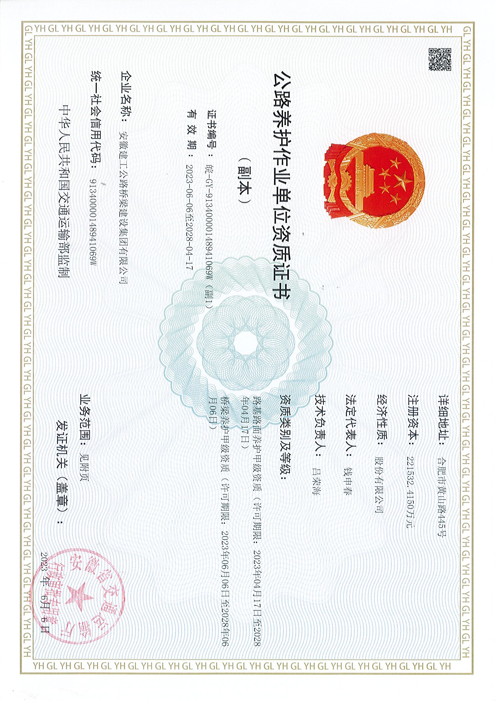 公路工程施工總承包特級、公路路面工程專業(yè)承包壹級、公路路基工程專業(yè)承包壹級、公路交通工程(公路安全設(shè)施)專業(yè)承包壹級