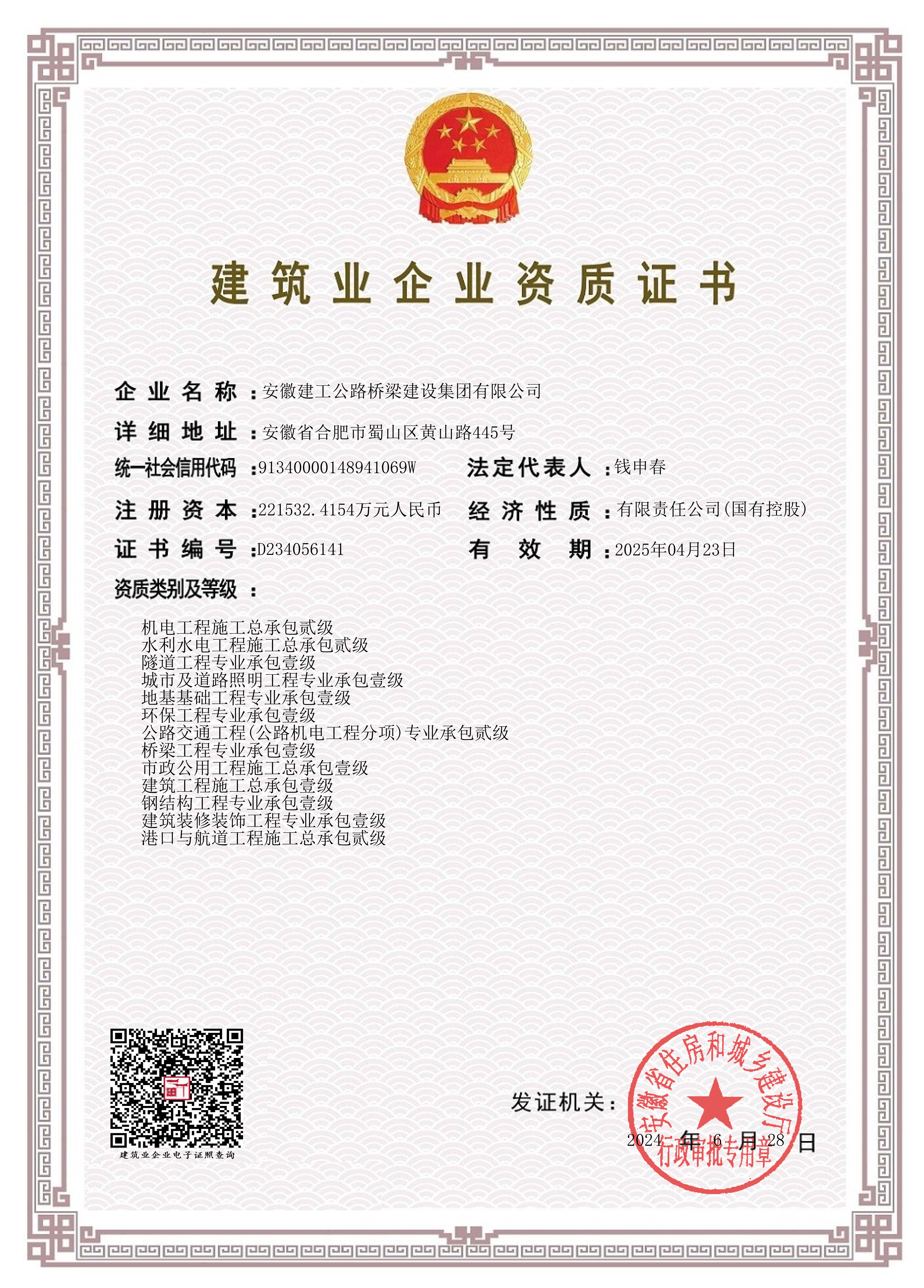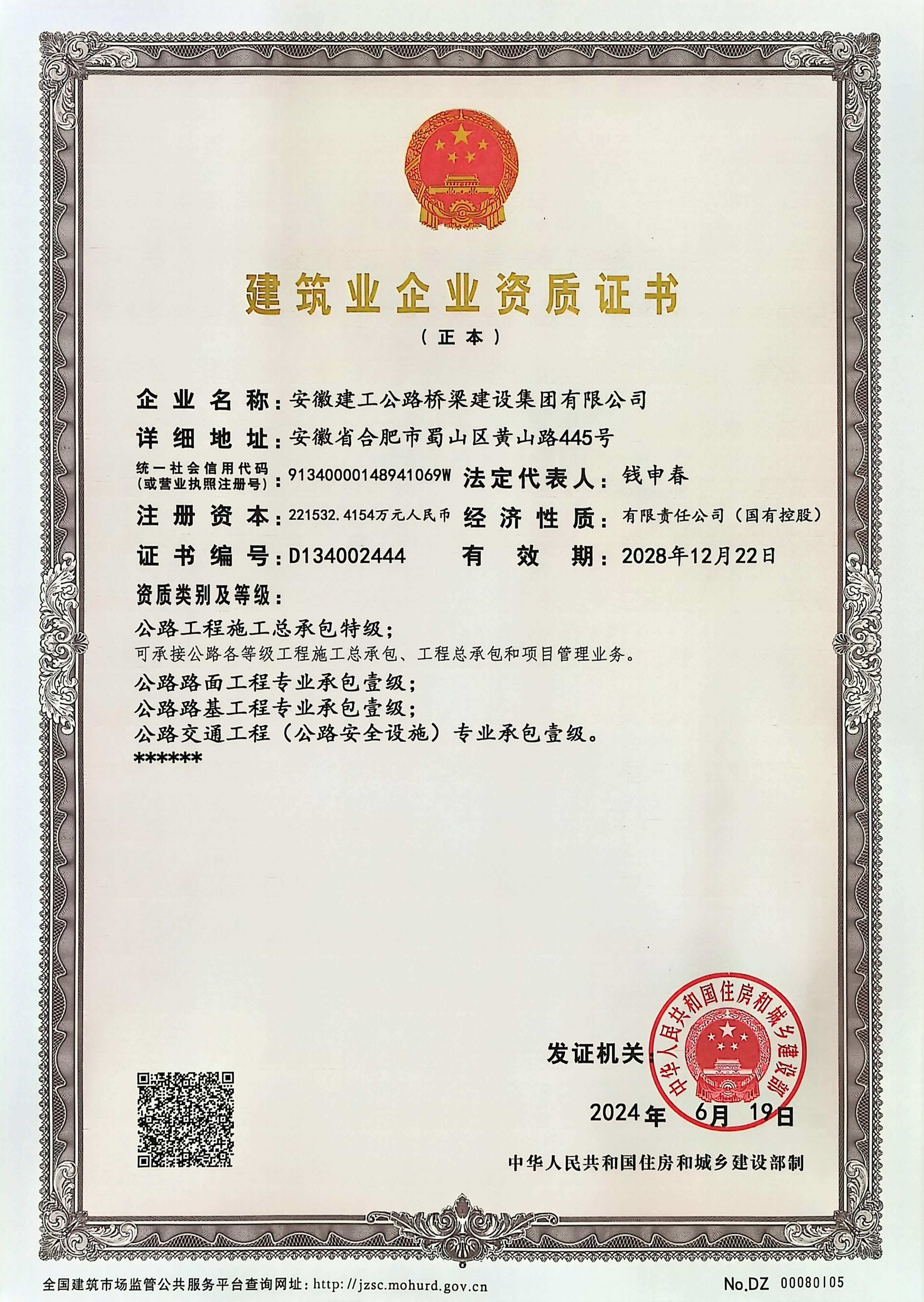 隧道工程專業(yè)承包壹級、城市及道路照明工程專業(yè)承包壹級、地基基礎(chǔ)工程專業(yè)承包壹級、環(huán)保工程專業(yè)承包壹級、橋梁工程專業(yè)承包壹級、市政公用工程施工總承包壹級、建筑工程施工總承包壹級、鋼結(jié)構(gòu)工程專業(yè)承包壹級、建筑裝修裝飾工程專業(yè)承包壹級